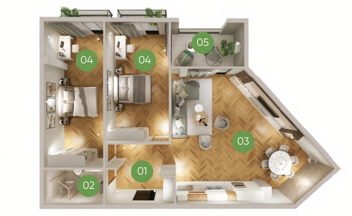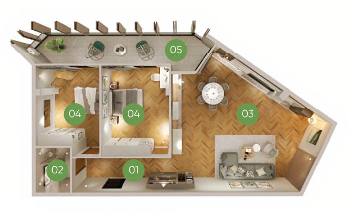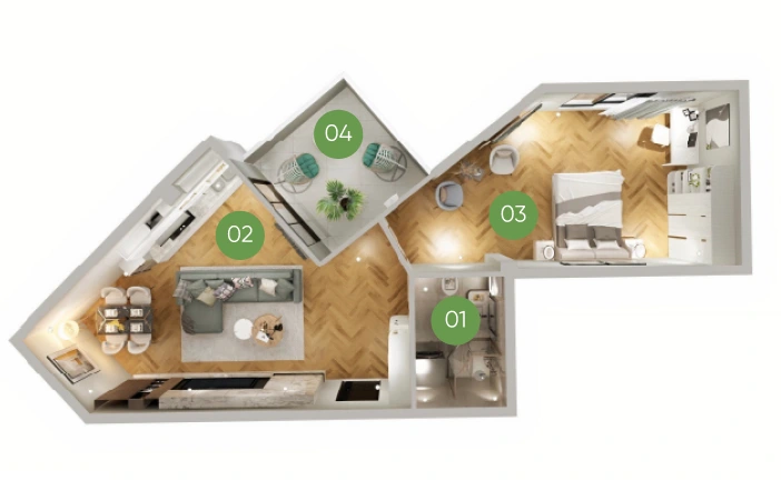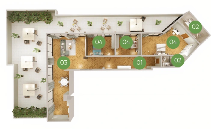 პროექტში აპარტამენტების მინიმალური ფართი – 32 კვ.მ-ია, მაქსიმუმ 400 კვ.მ-ია. სადაც თქვენ გაქვთ შესაძლებლობა, თავად დააგეგმაროთ აპარტამენტი ჩვენს არქიტექტორებთან ერთად. ბინები ბარდება მწვანე კარკასის მდგომარეობაში, თუმცა სურვილის შემთხვევაში ჩვენი პარტნიორი სარემონტო კომპანია „აპარტ შოურუმი“ უზრუნველყოფს დიზაინის შექმნასა და ბინის სრულ რემონტს.